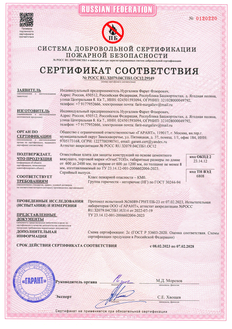 Наша компания предлагает Огнестойкие плиты для высокотемпературной изоляции под торговой маркой ОгнеСТОП (для печей, каминов). Плиты отличаются высокими теплоизоляционными свойствами, используются в большом диапазоне температур: от –50 до +400 °C. С успехом применяются при монтаже каминных топок, каминов, печей и дымоходов. Предназначены для термической изоляции нагревающихся элементов конструкций, создания термо и пожаробезопастных коробов для использования при постоянной температуре до 300 °С. Плиты ОгнеСТОП соответствуют требованиям пожарной безопасности по ТУ 23.14.12-001-2006602004-2023. Показатель пожарной опасности плиты – НГ по ГОСТ 30244-94. Класс пожарной опасности КМ0. Группы огнезащитной эффективности: EI 180, EI 150, EI 90. Материалы соответствуют всем существующим санитарно-гигиеническим, экологическим и противопожарным требованиям, действующим не только на территории Российской Федерации, но также многих зарубежных стран.