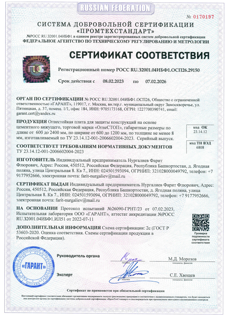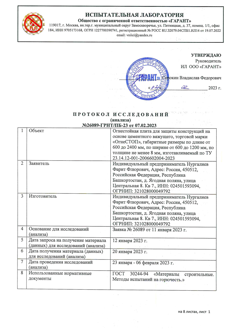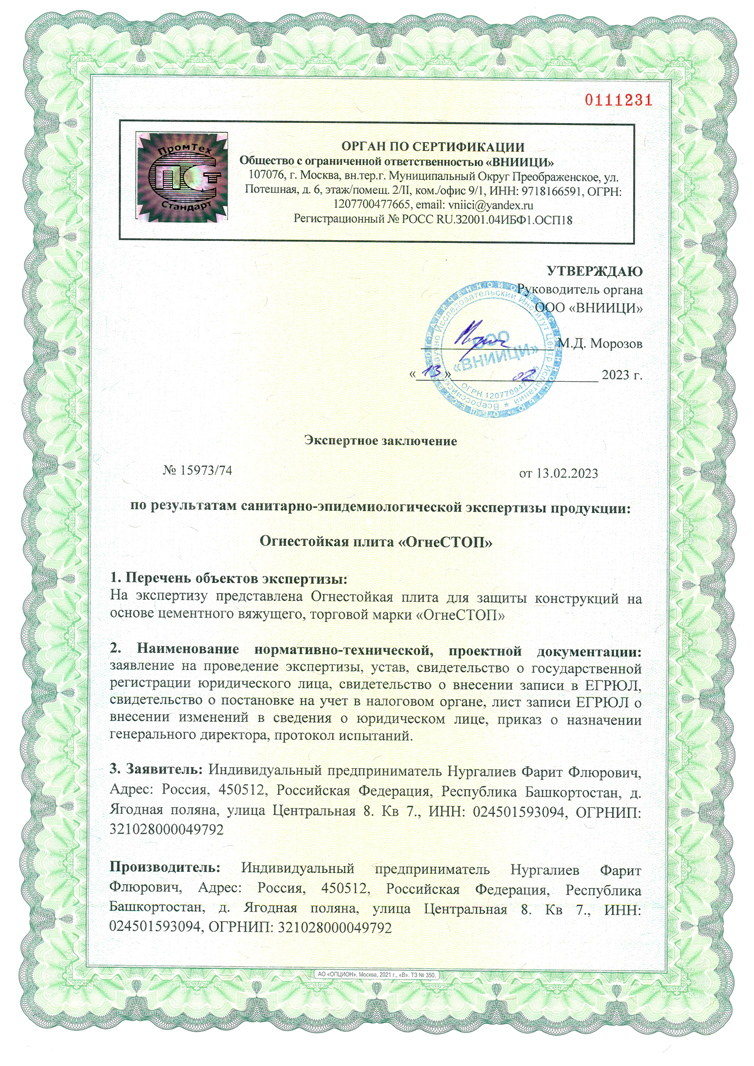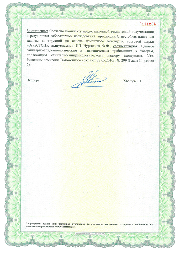 Огнестойкие плиты «ОгнеСТОП» изготавливаются из экологически чистых и безопасных природных минеральных составляющих: цемента, перлита*, целлюлозы и других компонентов, и армированы с двух сторон стеклосеткой. В составе плит отсутствует асбест и другие вредные соединения, способные нанести ущерб здоровью человека.