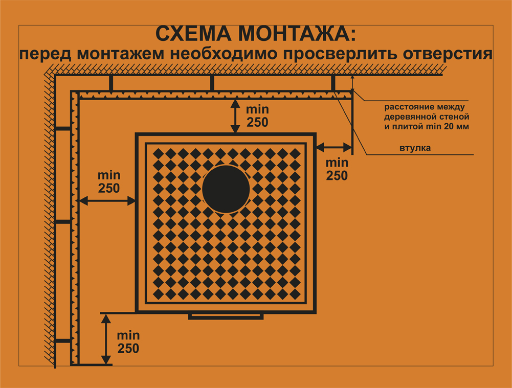 При монтаже плит на стены или потолок деревянного строения рекомендуется обеспечивать зазор между непосредственно самой поверхностью и плитой, используя керамические втулки, длиной не менее 30мм, также необходимо оставлять порядка 30 мм зазора между нижней частью панели и полом, с целью обеспечения конвекционного зазора для вентиляции воздуха и предупреждения сильного нагрева поверхностей. Плиты ОгнеСТОП монтируются встык, край к краю. При монтаже плит необходимо просверлить отверстия и следовать расстояниям, указанным на рисунке.